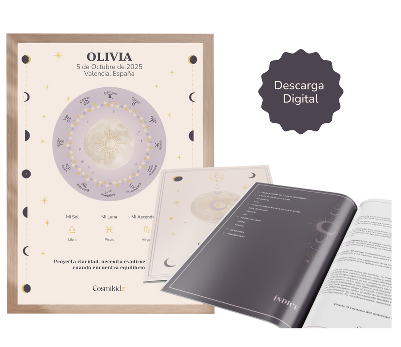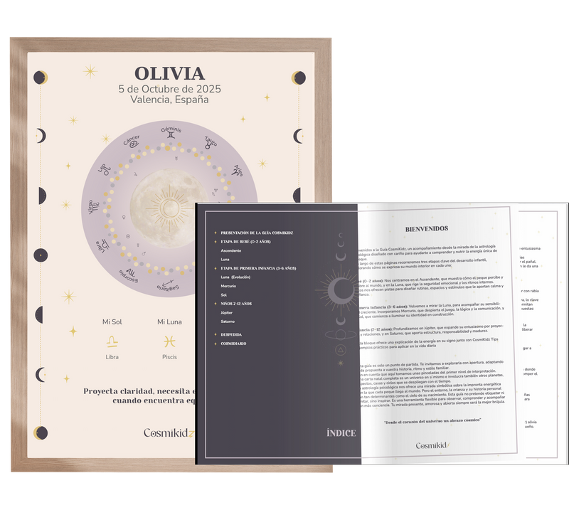 Incluye una lámina ilustrada de su carta natal y una guía personalizada con claves para entender sus emociones, aprendizajes y talentos… y disfrutar más del día a día juntos.